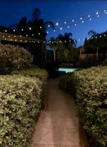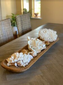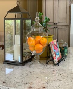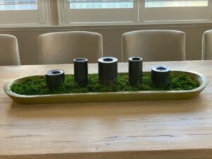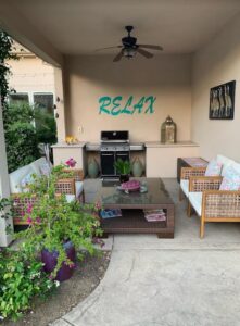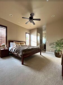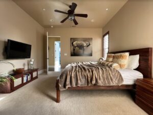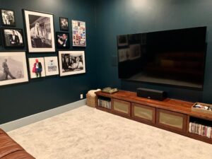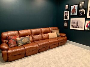 This movie room was updated to give a more classic feel. The paint was updated from tan to a midnight blue for a darker feel whilst watching movies. The ceiling and printed carpet are gray to tie in with the black and white pictures. The cushions on the couch complement the colors on the walls. The credenza has balance on the ends using a chess set and a tray for the remotes, as well as baskets holding throws for those cozy movie nights!