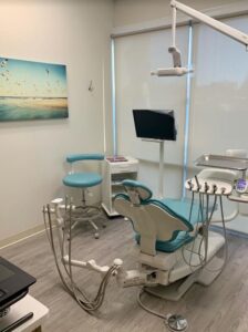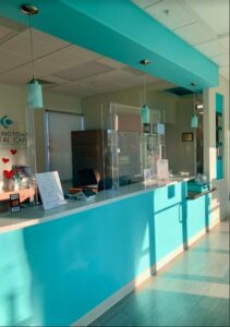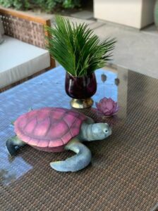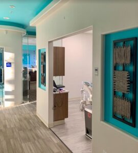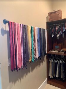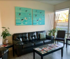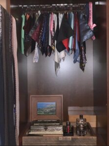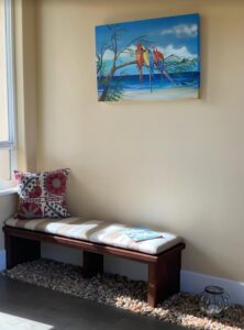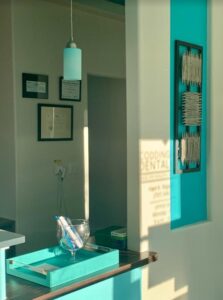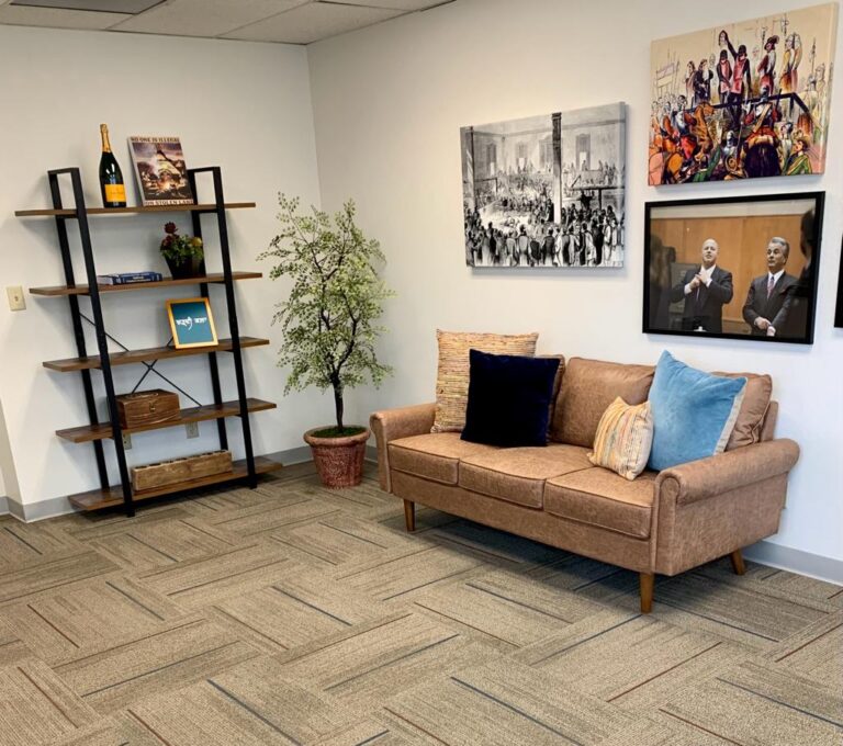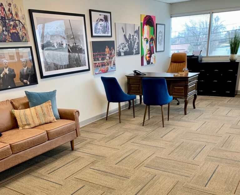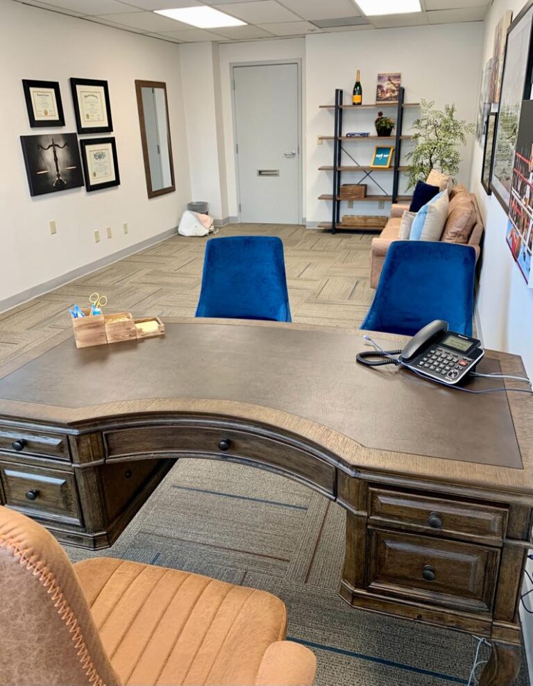 This office is one rectangular room that’s not very wide and so needed careful planning. The right side when you enter serves as a walkway and was left open. A long twenty seven foot wall on the left was used as a gallery wall to pull the office together. A smaller wall on the right holds diplomas as well as a scales of justice piece. There are two chairs at the main desk as well as a sofa for client seating. The back of the office holds filing cabinets and credenza for storage. The office was kept traditional and serious with pops of color in blue.