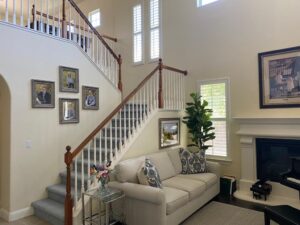The highlight of this room is the dramatic gallery wall holding pictures in both black and white as well as color. There is is also a mix of framed artwork and canvases.